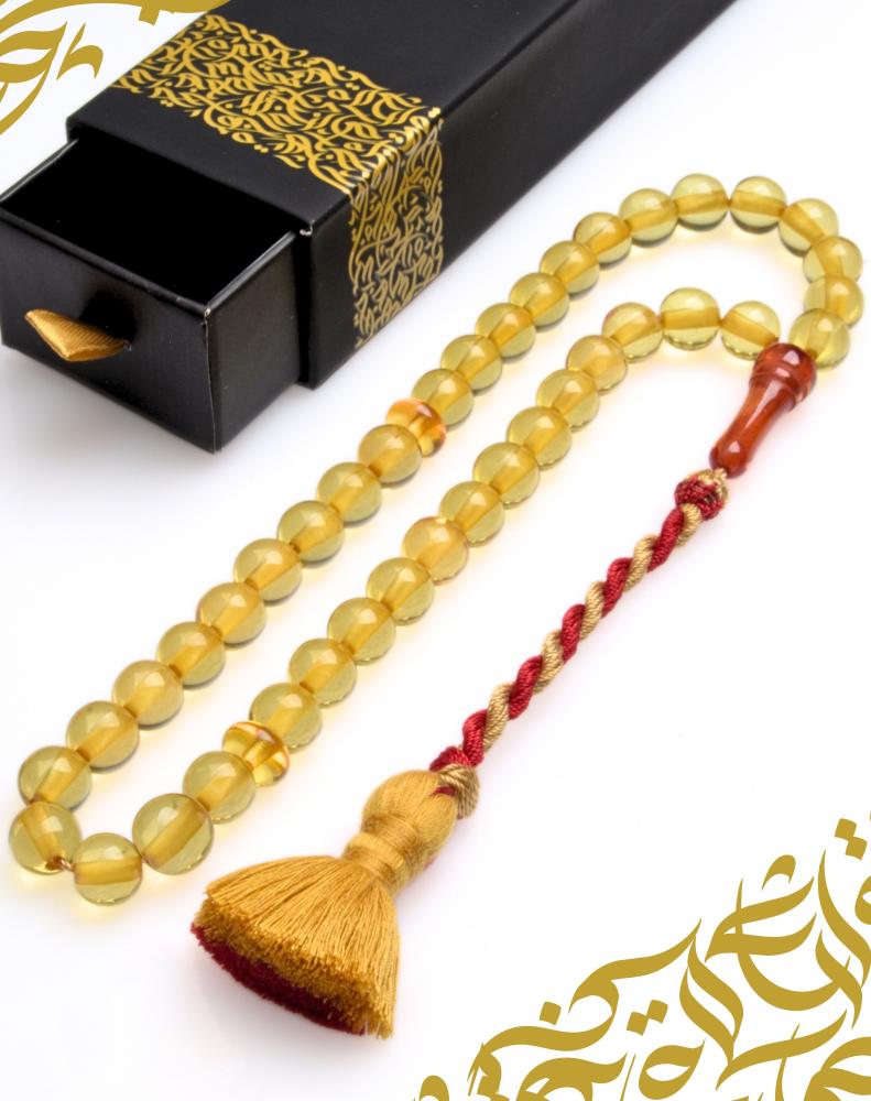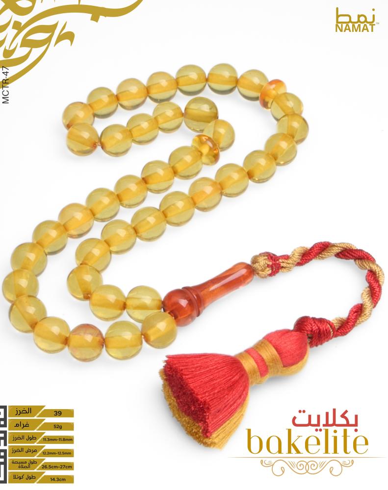 مسبحة من الباكليت باللون الأصفر الكهرماني الشفاف مكونة من 39 حبة مع شرابة مصنوعة يدويًا.